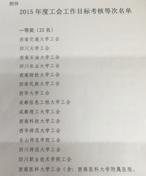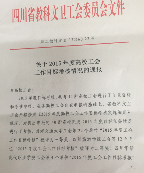 2016年11月16日上午,四川省教科文卫工会第三届委员会第五次全体会议在成都金河宾馆召开。大会宣布了全省教育系统优秀教职工代表提案评选结果。我校推荐的羊裔高代表“关于成立学校创新创业中心”的提案荣获二等奖;巩远发代表的“加强外聘员工培训工作”的提案荣获三等奖。